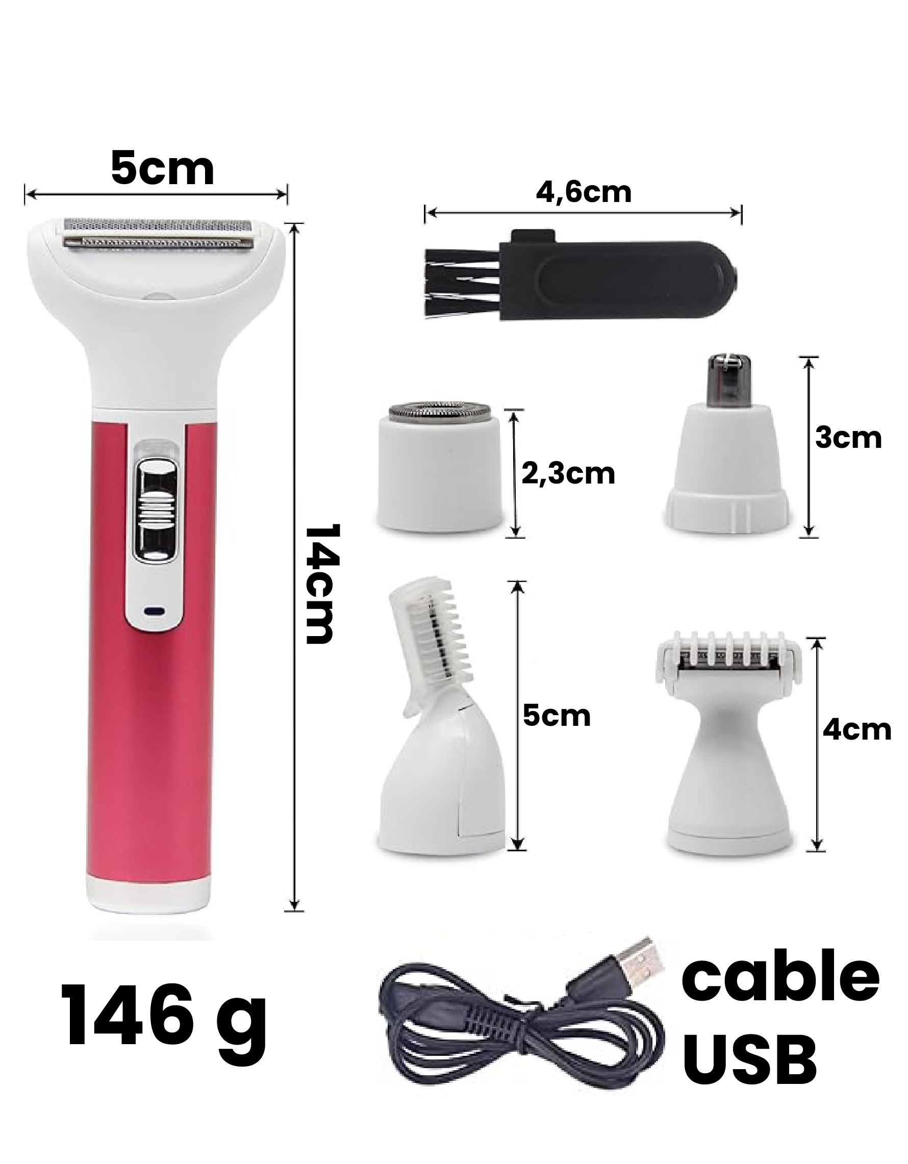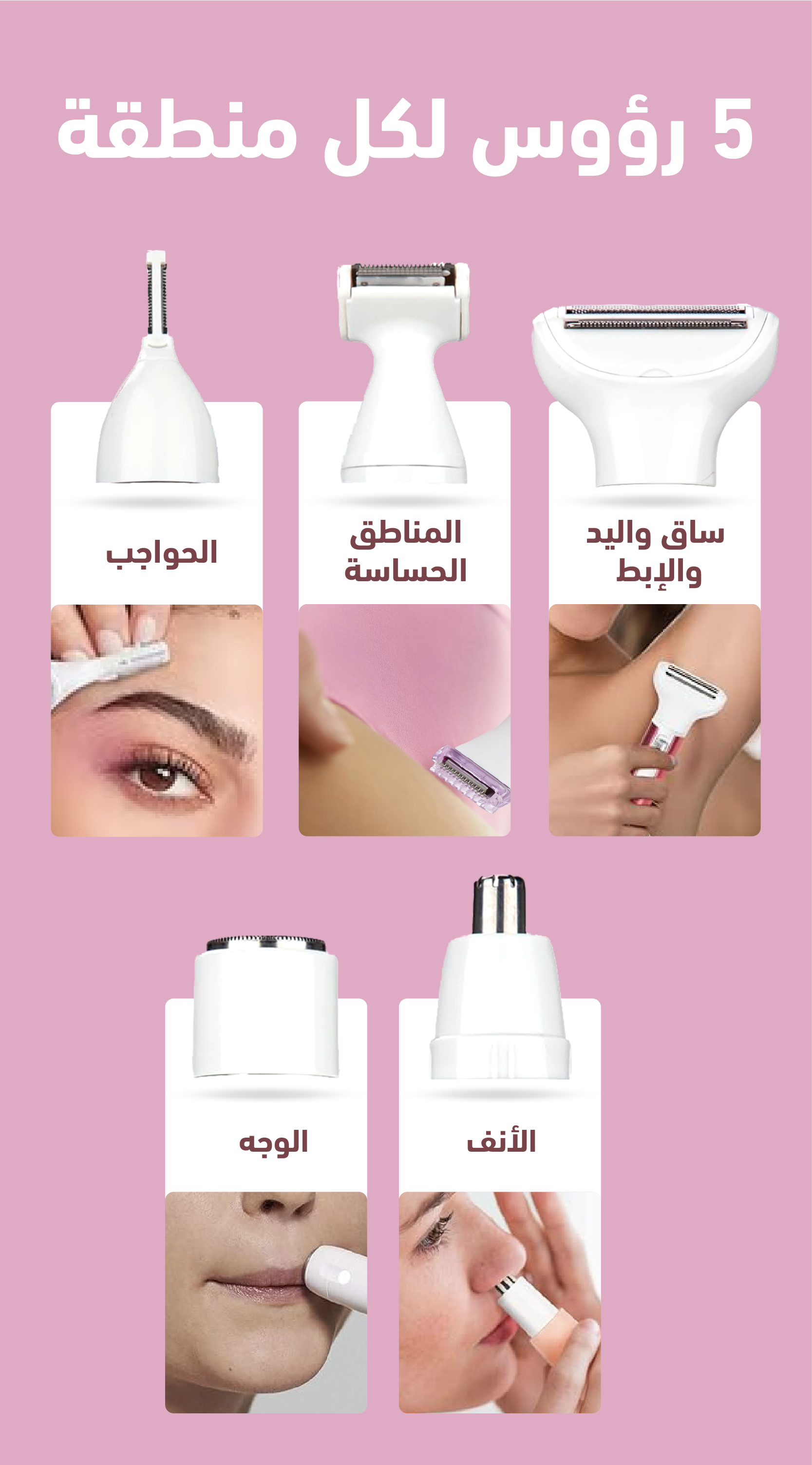 5 وظائف في ماكينة واحدة، لإزالة الشعر من الوجه، الساقين، الذراعين وحتى المناطق الحساسة.